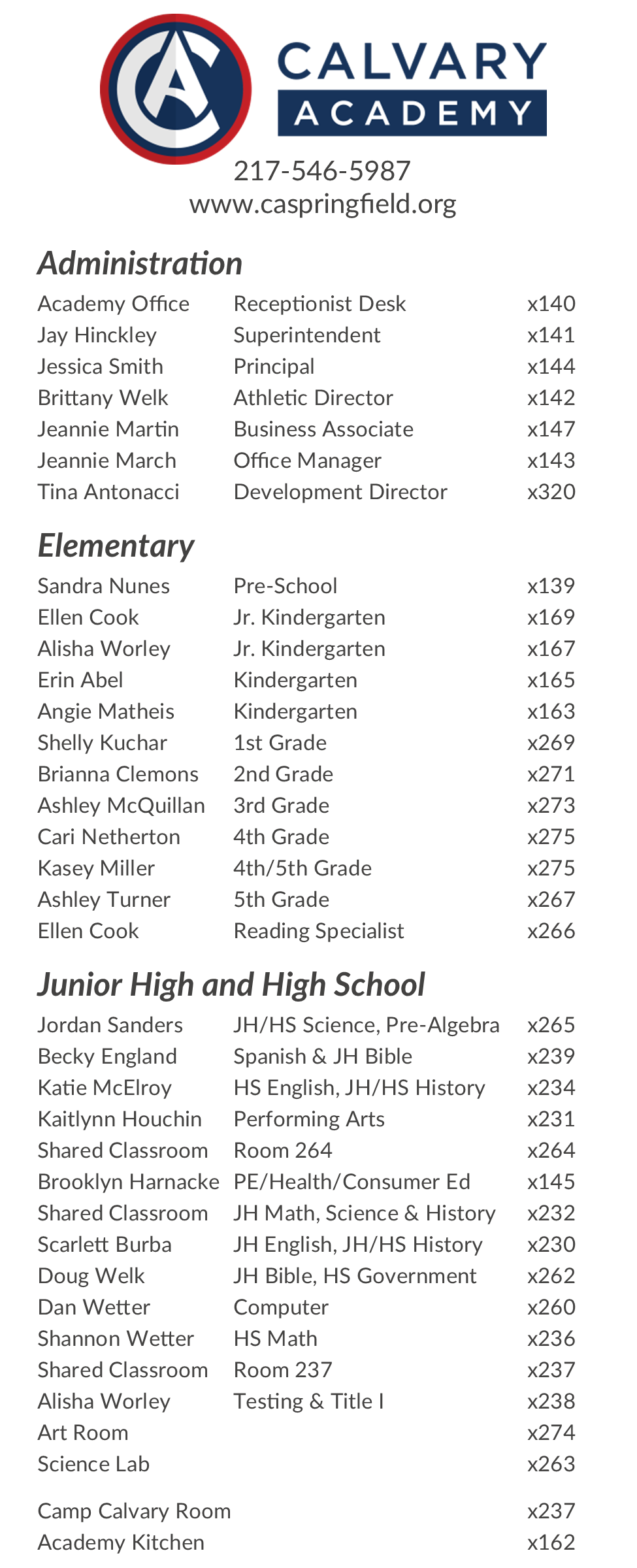 We are happy to answer your questions. You may contact the Academy Office at 217-546-5987 to speak to a member of our staff or send your questions via email to CalvaryAcademy@CASpringfield.org.
